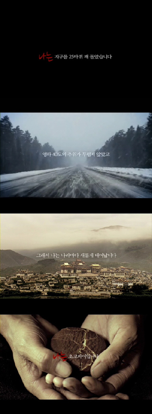 마치 한편의 다큐멘터리 영화를 보는 듯한 착각을 일으키게 하는 이번 ‘초코파이’ 광고는 지난 7월부터 '파이로드를 따라 지구와 정을 맺다'의 콘셉트로 방영되고 있는 '오지'편, '아버지'편, '문화'편을 하나의 스토리로 묶은 총 2분 분량의 '옴니버스' 편으로 새로 편집된 광고다.