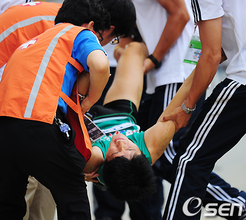김덕현이 발목을 다쳐 들려나가고 있다. / rumi@osen.co.kr