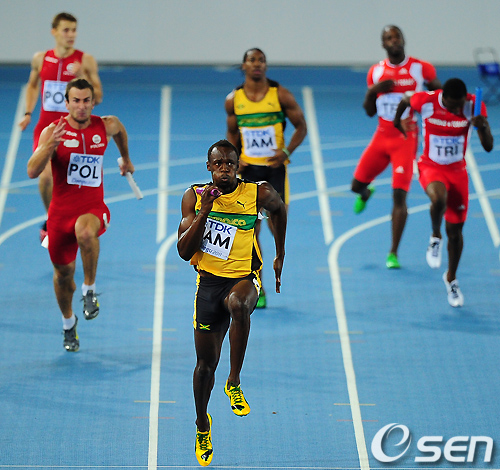 4일 오후 대구 스타디움에서 열린 '2011 대구 세계육상선수권대회' 남자 4X100m 릴레이 결승에서 '번개' 우사인 볼트(25, 자메이카)가 마지막 주자로서 자메이카를 남자 400m 계주 우승으로 이끌었다. 자메이카는 2008 베이징 올림픽에서 자신들이 수립한 세계 신기록을 경신했다.