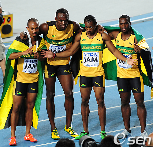 4일 오후 대구 스타디움에서 열린 '2011 대구 세계육상선수권대회' 남자 4X100m 릴레이 결승에서 '번개' 우사인 볼트(25, 자메이카)가 마지막 주자로서 자메이카를 남자 400m 계주 우승으로 이끌었다. 자메이카는 2008 베이징 올림픽에서 자신들이 수립한 세계 신기록을 경신했다.