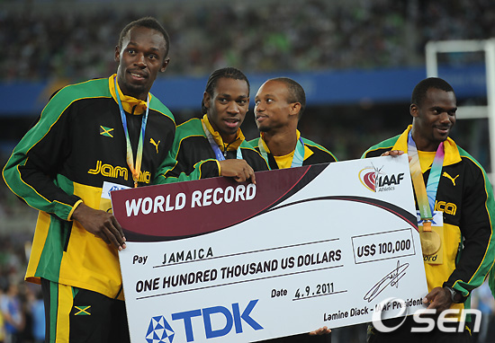 자메이카 선수들이 세계신기록 포상금을 들고 기뻐하고 있다./rumi@osen.co.kr