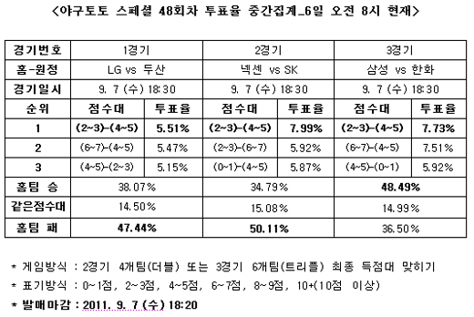 주말 프로야구 3경기 대상 야구토토 스페셜 48회차 투표율 중간집계