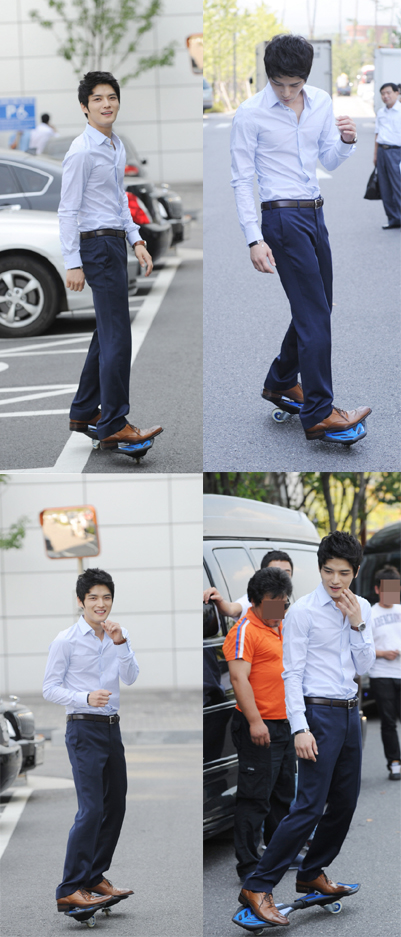 최근 ‘보스를 지켜라’ 촬영이 한창이던 성남 시청 주차장에서 김재중은 자신의 차에서 에스보드 꺼내더니 이내 현란하게 타는 모습을 보여주기 시작했다.