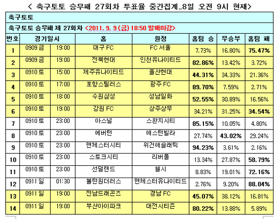축구토토 승무패 27회차 투표율 중간집계 결과