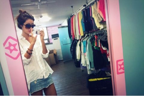 사진 속 박한별은 흰 셔츠와 청치마로 깔끔하면서도 눈에 띄는 스타일을 완성했으며 선글라스를 낀 채 거울에 비친 자신의 모습을 찍고 있다.