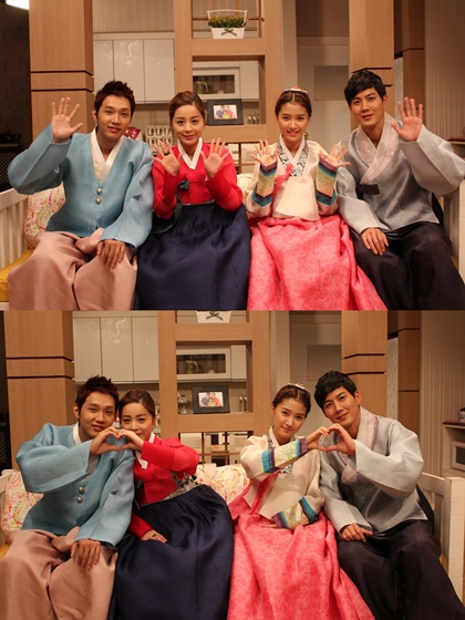 MBC 주말연속극 ‘천 번의 입맞춤’의 우주영-장우빈, 장우진-우주미 커플을 이루고 있는 4인방은 바쁜 드라마 촬영 일정 속에서도 시청자들에게 한가위 인사를 잊지 않고 색색의 한복을 차려 입고 그들만의 매력을 선보였다.