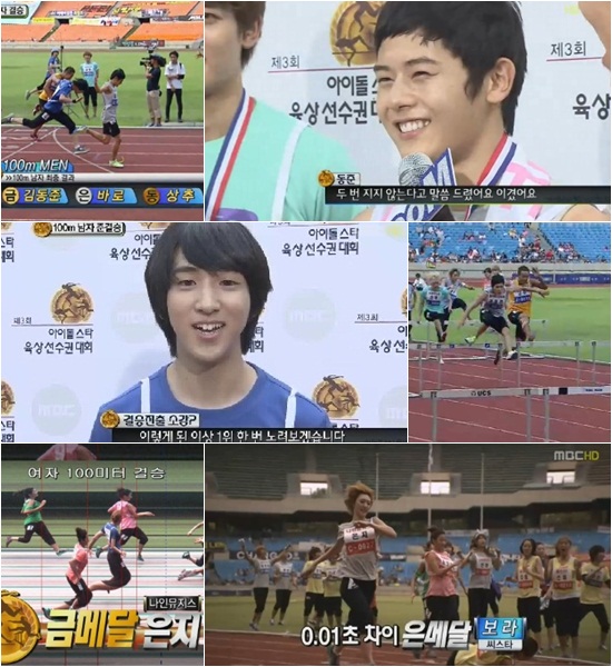 가장 치열했던 100m 남자 결승에서 아이돌계의 우사인볼트의 영광은 제국의아이들 동준에게 돌아갔다. 동준은 강력한 우승후보 샤이니 민호, 마이티마우스 상추, B1A4 바로 등을 제치고 금메달을 획득했다.