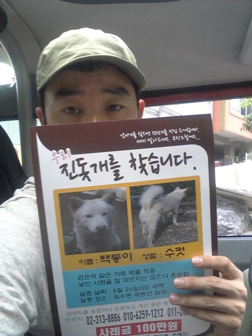 사진 속에 엄태웅은 전단지를 들고 있다. 그가 들고 있는 전단지에는 '우리 진돗개를 찾습니다'라는 글과 백통이에 대한 설명이 쓰여 있다.