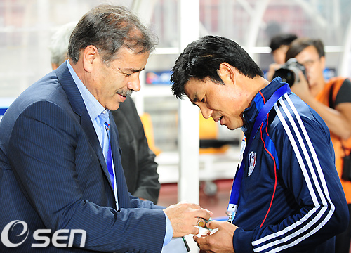 만수르 에브라힘자데 조바한 감독이 윤성효 삼성 감독에게 경기 전 선물을 주고 있다/ rumi@osen.co.kr