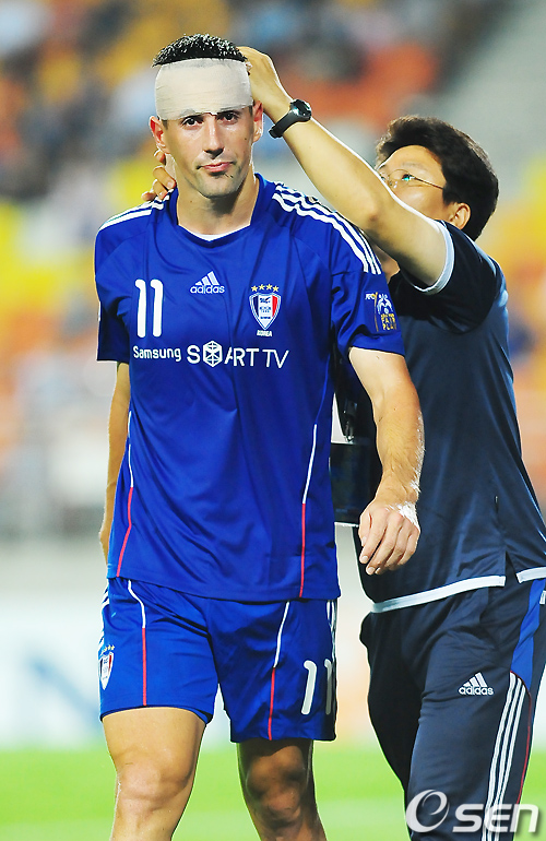 전반 수원 스테보가 조바한 문전에서 충돌한 후 붕대를 감고 있다. / rumi@osen.co.kr