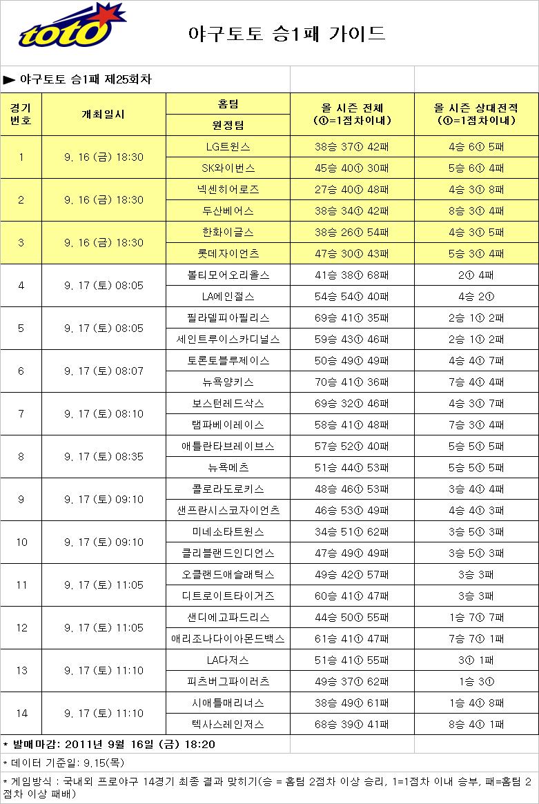 두 팀간 올 시즌 상대전적은 7승 8패(LG기준)로 이번 경기에서 치열한 접전을 벌일 것으로 예상됐다. 넥센-두산(2경기)전에서는 최근 10경기 7승 2패로 순조로운 경기를 펼치고 있는 두산이 넥센을 상대로 승리를 거둘 것(47.55%)으로 전망됐다. 야구토토 승1패 25회차 게임은 오는 16일 오후 6시 20분에 발매가 마감된다.