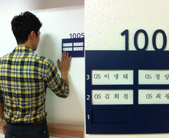 사진 속 최시원은 병실 앞 환자 이름 중 김희철의 이름을 발견하고 그리워하는 포즈를취하고 있다.
