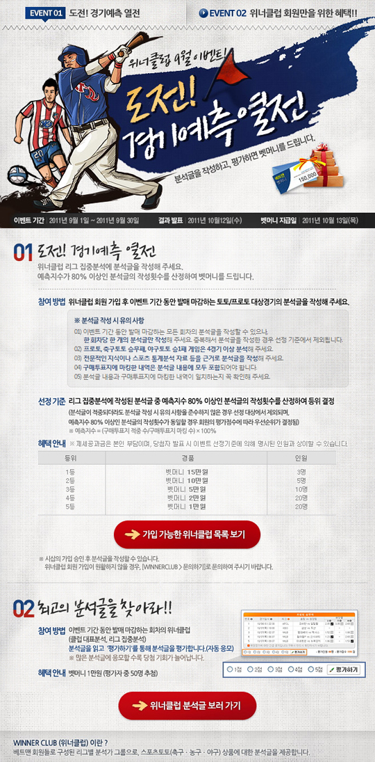 이와 동시에 진행되는 두 번째 이벤트 '최고의 분석글을 찾아라'는 위너클럽 회원이 작성한 분석글을 읽고 평가에 참여하면 응모할 수 있다. 평가자 중 50명을 추첨해 벳머니 1만원을 지급하고, 많은 분석글을 읽고 평가할수록 당첨 기회는 늘어난다.