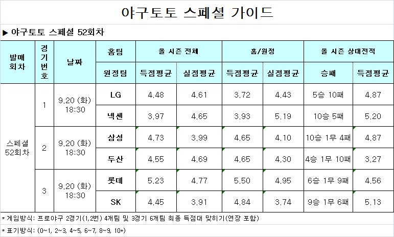 이번 야구토토 스페셜 52회차 게임은 20일 오후 6시 20분에 발매가 마감된다.