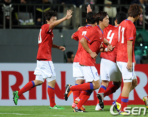 후반 대한민국 김보경이 팀의 두번째 골을 성공시키고 동료들과 환호하고 있다. / sunday@osen.co.kr