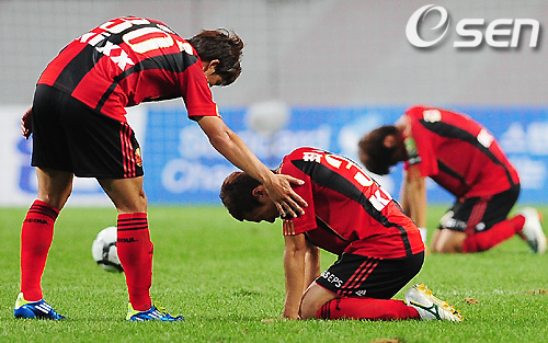 [OSEN=서울월드컵경기장 ,백승철 인턴기자] 24일 오후 서울월드컵경기장에서 열린 '현대오일뱅크 K리그 2011' FC 서울과 대전 시티즌의 경기, 경기종료후 FC 서울 강정훈이 최태욱을 토닥여주고 있다.