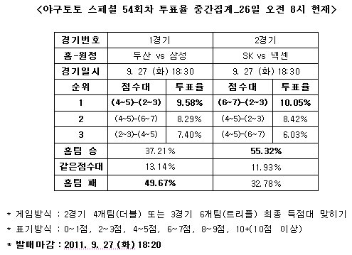 국민체육진흥공단(www.kspo.or.kr)이 발행하는 체육진흥투표권 수탁사업자인 스포츠토토 공식 온라인 발매 사이트인 베트맨(www.betman.co.kr)이 27일 열리는 국내 프로야구 2경기를 대상으로 한 야구토토 스페셜 54회차 투표율을 중간 집계한 결과, 국내 야구팬 49.67%는 두산-삼성(1경기)전에서 삼성의 승리를 예상했다.