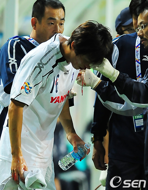 전반 세레소 김보경이 전북 최철순에게 반칙을 당해 벤치쪽으로 들어가 지혈을 하고 있다./ rumi@osen.co.kr