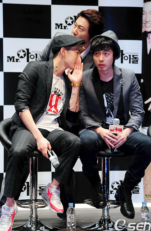 [OSEN= 백승철 인턴기자] 28일 오후 서울 건대입구 롯데시네마에서 열린 영화 'Mr.아이돌' 제작보고회에서 박재범, 장서원, 김수로가 상황 개그를 하고 있다.