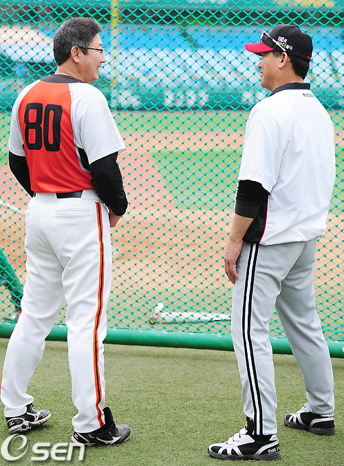 LG 박종훈 감독과 한화 한대화 감독이 그라운드 위에서 얘기를 나누고 있다./ rumi@osen.co.kr