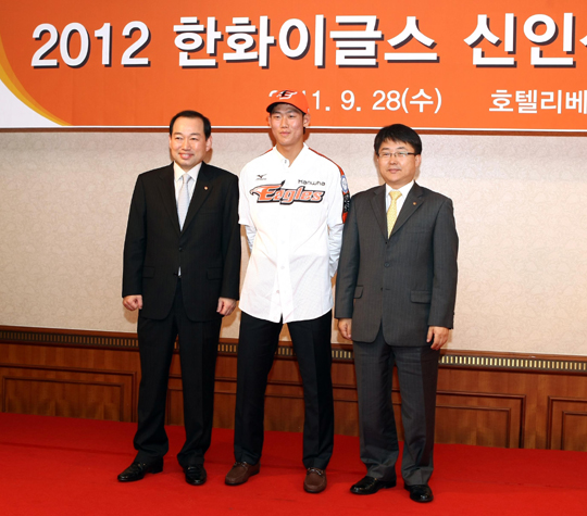 신인 드래프트 전체 1순위로 한화에 지명된 '초고교급' 내야수 하주석(17)이 우상으로 꼽은 '야왕' 한대화 감독과 처음 만났다. 28일 입단식을 갖고 처음으로 대전 홈구장을 방문한 하주석은 곧바로 신인선수들과 함께 한대화 감독과 간단한 상견례를 가졌다. 평소 한대화 감독을 롤모델이라고 이야기한 하주석이 한 감독과 처음 만난 순간이었다.