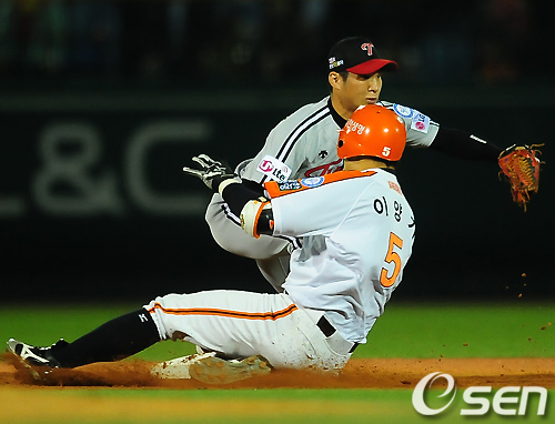 1회말 1사 주자 2루 한화 이양기가 우전 1타점 적시타를 날린 후 2루에 몸을 날리고 있다./ rumi@osen.co.kr