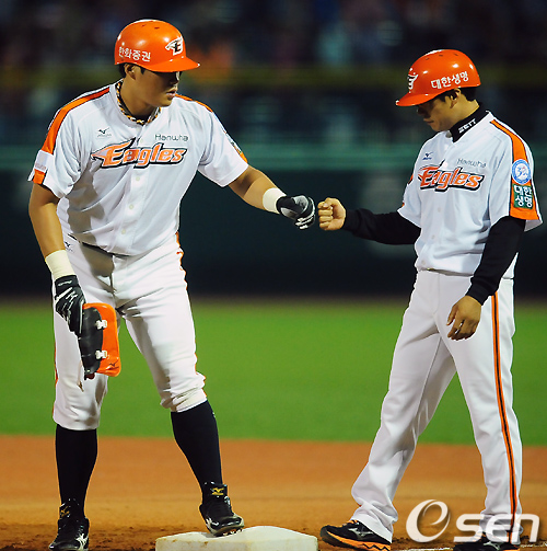 1회말 1사 주자 2루 한화 최진행이 중견수 왼쪽 역전 1타점 적시타를 날린 후 1루에서 최만호 코치와 하이파이브를 하고 있다./ rumi@osen.co.kr
