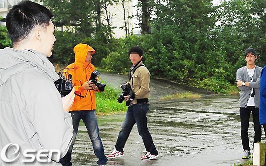 김준이 부대 근처 연무대 앞에서 인터뷰를 할때 티맥스의 멤버 박한비가 이 모습을 바라보고 있다. / rumi@osen.co.kr