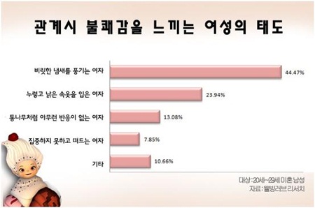 가장 많이 나온 의견이 냄새를 풍기는 여자(44.47%)였으며, 낡은 속옷이 관계 시 불쾌감을 줬다는 의견(23.94%)이 그 뒤를 이었다. 그 외 아무런 반응이 없는 여자(13.08%), 집중하지 못하고 계속 이야기 하려는 여자(7.85%) 순이었다.