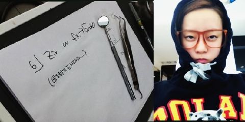 고우리는 30일 오전 자신의 트위터를 통해 "이가 깨져서 치과에 왔다. 간호사 언니: 왜 이렇게 되셨어요? 나:........."라는 글과 함께 사진을 올렸다.