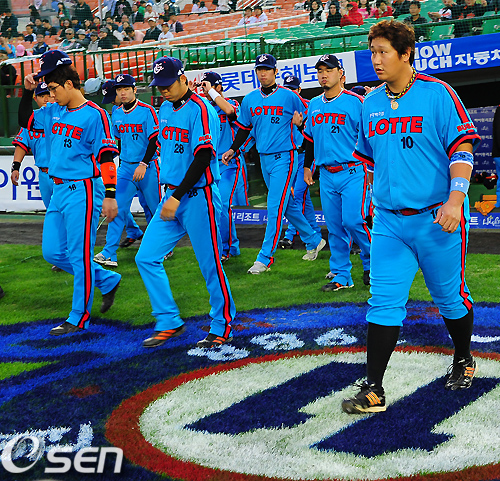 경기 전 '최동원의 날' 행사를 위해 롯데 선수들이 그라운드로 나서고 있다./ rumi@osen.co.kr