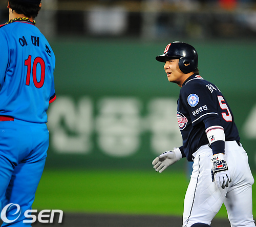 2회초 무사 주자 1,2루 두산 윤석민이 중월 스리런 홈런을 날린 후 1루를 돌때 윤석민이 이대호와 가볍게 충돌한 후 말을 걸고 있다./ rumi@osen.co.kr