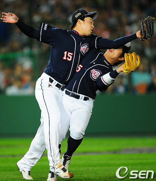3회말 첫타석에서 롯데 강민호의 플라이 타구를 두산 안규영 투수가 잡으려고 할때 팔꿈치로 윤석민 얼굴을 강타하고 있다./ rumi@osen.co.kr