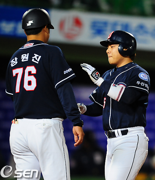 2회초 무사 주자 1,2루 두산 윤석민이 중월 스리런 홈런을 날린 후 홈에서 장원진 코치와 하이파이브를 하고 있다./ rumi@osen.co.kr