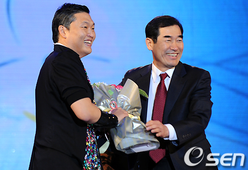 가수 싸이가 오철식 국방홍보원장에게 감사패를 받고 있다. / sunday@osen.co.kr
