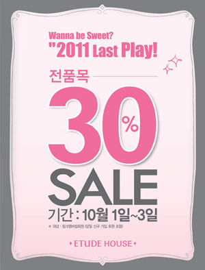 10월 1일부터 3일까지 3일간 메이크업 전문 브랜드 에뛰드하우스(www.etude.co.kr)가 2011년 마지막 세일을 시작한다.