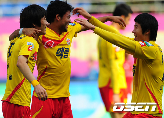 1일 오후 대전 월드컵경기장에서 열린 현대오일뱅크 K리그 2011 대전 시티즌과 성남 일화의 27R 경기에서 전반 15분 성남 에벨찡요가 헤딩슛으로 팀 추가골을 성공시킨 후 기뻐하고 있다.