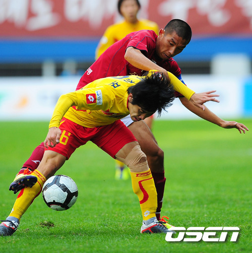 1일 오후 대전 월드컵경기장에서 열린 현대오일뱅크 K리그 2011 대전 시티즌과 성남 일화의 27R 경기에서 후반 성남 박진포와 대전 한재웅이 치열한 볼다툼을 하고 있다.