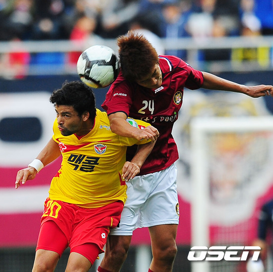1일 오후 대전 월드컵경기장에서 열린 현대오일뱅크 K리그 2011 대전 시티즌과 성남 일화의 27R 경기에서 후반 성남 에벨찡요와 대전 김태연이 공중볼 다툼을 하고 있다.