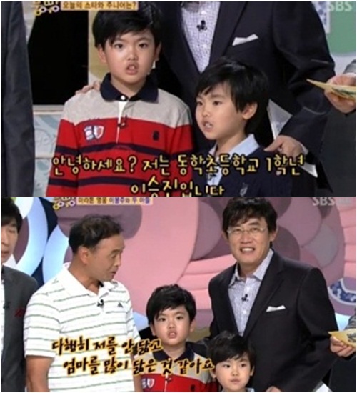 1일 방송된 SBS 예능프로그램 '스타주니어쇼-붕어빵'에는 이봉주가 얼짱으로 유명한 두 아들 우석, 승진 군과 함께 출연해 눈길을 끌었다.