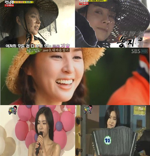 송지효는 SBS '일요일이 좋다, 런닝맨'에 고정 출연하며 소탈한 모습으로 동네 누나같은 털털한 매력의 진수를 보여주고 있다. 예쁜척을 하거나 도도한 이미지는 벗어버린지 오래다. 송지효하면 '에이스'라는 말이 표현해주듯 '승부근성'과 탁월한 '감각'으로 레이스를 주도한다. 거기에 자주 보여주는 민낯과 이동 중 차안에서 춥다며 옷 속으로 팔을 집어 넣는 모습은 그야말로 '빵'하고 폭소가 터지게 만들었다.