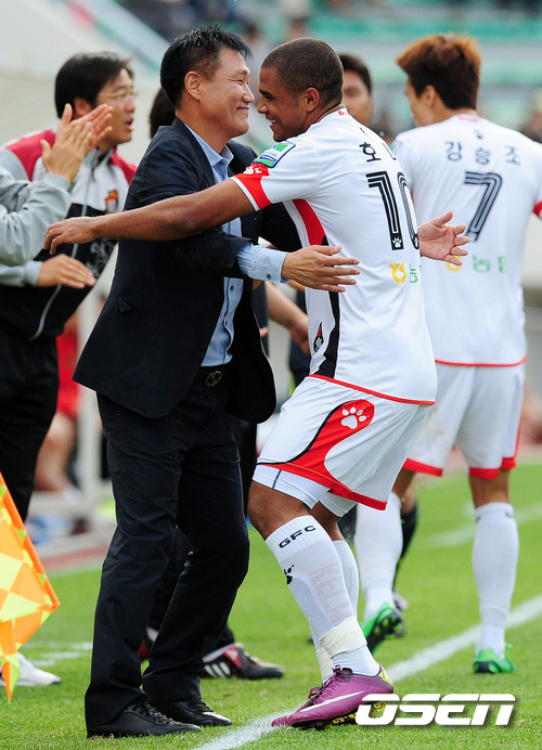 2일 오후 부산 구덕운동장에서 열린 '현대오일뱅크 K리그 2011' 27라운드 부산 아이파크와 경남 FC의 경기, 전반 경남 호니가 선제골을 성공시키고 최진한 감독과 포옹을 하며 기뻐하고 있다.승점 40점으로 6위권을 유지하고 있는 부산은 4경기가 남은 상황에서 경남전이 6강 플레이오프 진출의 향방을 정할 중요한 경기이다. 팀의 간판 스리톱 한상운, 임상협, 파그너의 공격력에 기대를 걸고 있다. 반면 사실상 6강 진출이 무산된 9위 경남은 '중원사령관' 윤빛가람에 기대를 걸며 승리를 노리고 있다./ jpnews@osen.co.kr