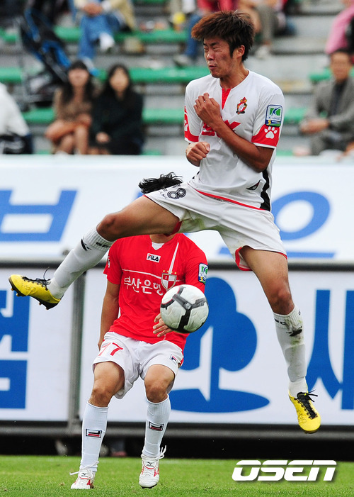 2일 오후 부산 구덕운동장에서 열린 '현대오일뱅크 K리그 2011' 27라운드 부산 아이파크와 경남 FC의 경기, 후반 부산 최광희의 크로스가 경남 이효균의 가랑이 사이로 통과되고 있다.