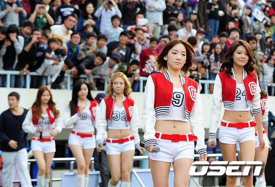 소녀시대는 2일 오후 부산 구덕운동장에서 열린 '현대오일뱅크 K리그 2011' 27라운드 부산 아이파크와 경남 FC의 경기에 홈팀 부산의 승리를 응원하기 위해 방문, 하프타임에 멋진 공연을 선보였다.