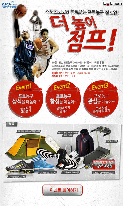 스포츠토토와 함께하는 프로농구 점프업! 더 높이 점프! 이벤트 화면