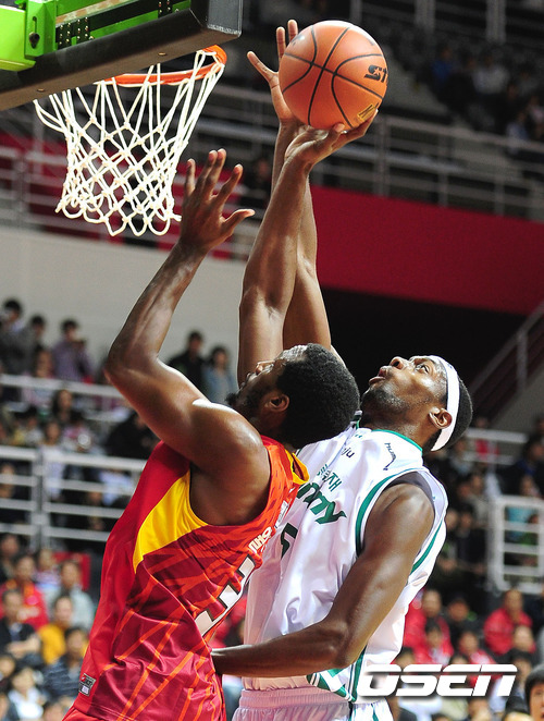 1쿼터 동부 로드 벤슨이 오리온스 윌리엄스의 슛을 블로킹 하고 있다.