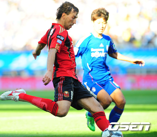 3일 오후 수원 월드컵경기장에서 열린 현대오일뱅크 K리그 2011 수원 삼성과 FC 서울의 27R 경기에서 전반 서울 데얀이 문전에서 강슛을 날리고 있다.