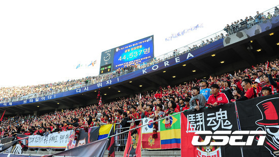 3일 오후 수원 월드컵경기장에서 열린 현대오일뱅크 K리그 2011 수원 삼성과 FC 서울의 27R 경기에서 K리그 사상 최초로 월드컵 구장 만석을 기록하고 있다.