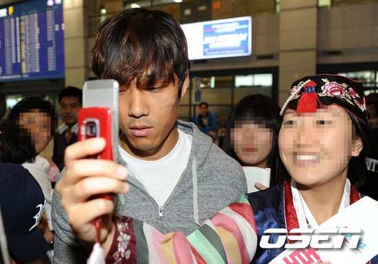아스널 박주영이 7일 열릴 폴란드와의 친선경기와 11일 월드컵 아시아지역 3차예선 아랍에미리트연합(UAE)과의 경기에 나서기 위해 3일 오후 인천국제공항을 통해 입국했다. 박주영이 팬들에게 둘러싸여 난감한 표정을 짓고 있다.