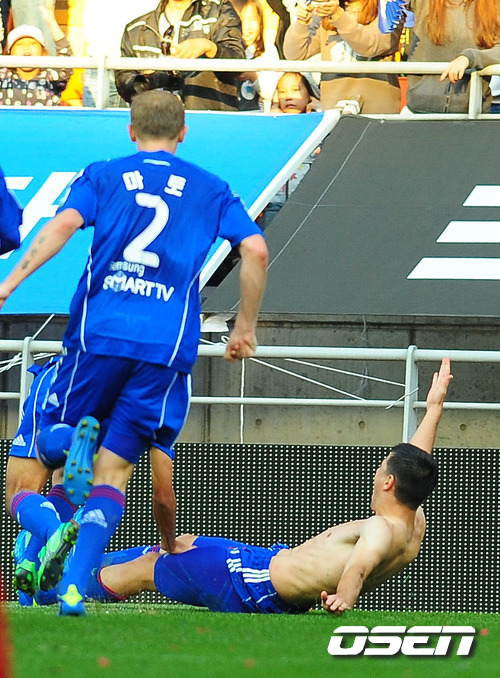 3일 오후 수원 월드컵경기장에서 열린 현대오일뱅크 K리그 2011 수원 삼성과 FC 서울의 27R 경기에서 후반 33분 수원 스테보가 선취 헤딩슛을 성공시킨 후 유니폼을 벗고 기뻐하고 있다.